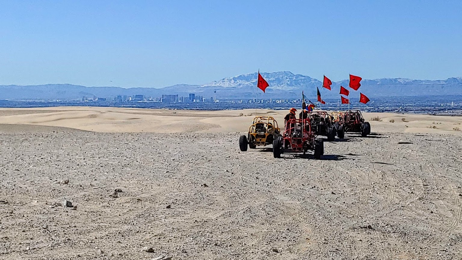 The Vegas Mini Baja Chase is SunBuggy’s most popular off-road adventure. Featured on several TV networks wold wide, the chase was even billed as “Sin City’s Best Near Death Experience” by Rolling Stone Magazine. Not for the faint of heart, you’ll spend your time chasing one of SunBuggy’s experienced Dunies where the only thing that will slow you down is if they’re waiting for you to catch up. You’ll navigate over aggressive and challenging terrain consisting of dunes, gravel, hard-pack hills, valleys, washed out creek beds, and trails running in every direction. For an extra kick – try the Vegas Mini Baja Chase A.D. (After Dark).